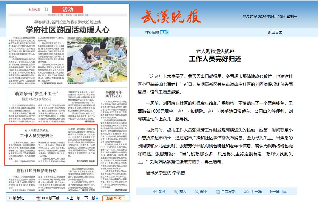 “这老年卡太重要了,我天天出门都得用。多亏超市那姑娘热心帮忙,也谢谢社区心里装着咱老百姓!”近日,东湖高新区关东街道雄庄社区的刘阿姨提起钱包失而复得,语气里满是感激。